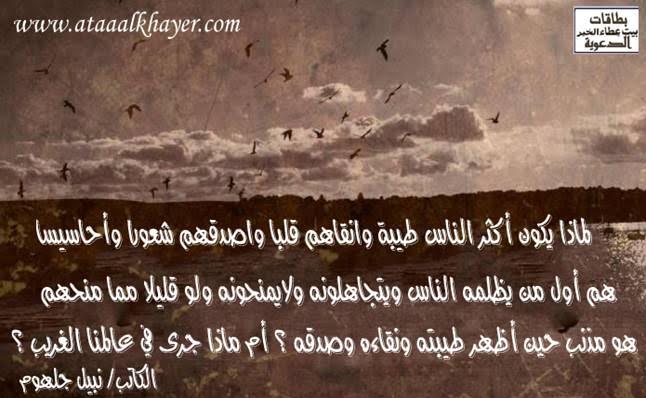 ماذا جرى في عالمنا ؟ الأخ الأستاذ / نبيل جلهوم عضو جمعية الكُتَّاب ببيت عطاء الخير عضو إتحاد الكتّاب و المثقفين العرب - مصر عضو رابطة أدباء الشام – لندن عضو الإتحاد العالمى للشعراء والمبدعين العرب http://www.ataaalkhayer.com/up/download.php?img=4538 |