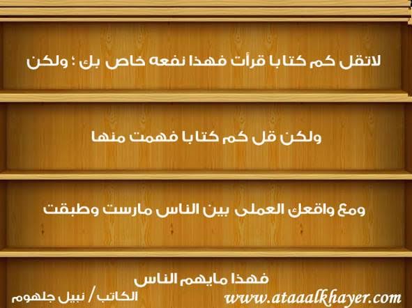لا تقل كم كتاباً قرأت الأخ الأستاذ / نبيل جلهوم عضو جمعية الكُتَّاب ببيت عطاء الخير عضو إتحاد الكتّاب و المثقفين العرب - مصر عضو رابطة أدباء الشام – لندن عضو الإتحاد العالمى للشعراء والمبدعين العرب http://www.ataaalkhayer.com/up/download.php?img=4740 |