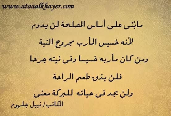 ما بُني على أساس المصلحة الأخ الأستاذ / نبيل جلهوم عضو جمعية الكُتَّاب ببيت عطاء الخير عضو إتحاد الكتّاب و المثقفين العرب - مصر عضو رابطة أدباء الشام – لندن عضو الإتحاد العالمى للشعراء والمبدعين العرب http://www.ataaalkhayer.com/up/download.php?img=4827 |