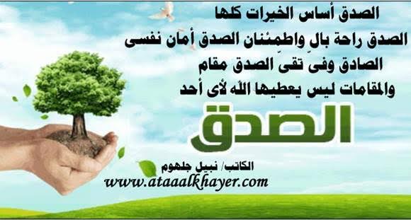 الصدق راحة الأخ الأستاذ / نبيل جلهوم عضو جمعية الكُتَّاب ببيت عطاء الخير عضو إتحاد الكتّاب و المثقفين العرب - مصر عضو رابطة أدباء الشام – لندن عضو الإتحاد العالمى للشعراء والمبدعين العرب http://www.ataaalkhayer.com/up/download.php?img=5337 الصدق: راحة ، ثروة ، روح ، تربية ، تميز فى الصدق: حياة ، سعادة ، أمان ، وفى غيره خسارة و وفاة فإلى كل الصادقين هنيئا لكم وإلى كل غيرهم عظم الله أجركم |