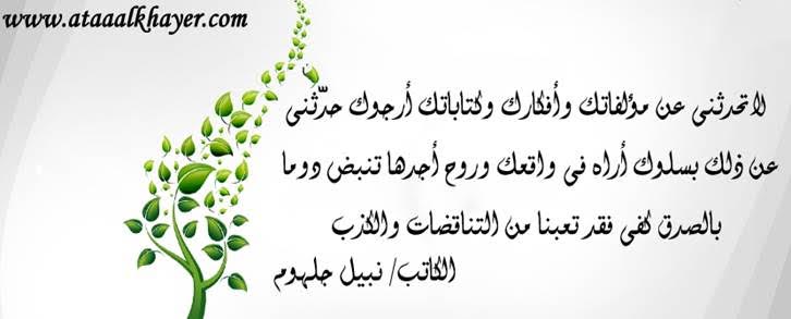 تعبنا من التناقضات الأخ الأستاذ / نبيل جلهوم عضو جمعية الكُتَّاب ببيت عطاء الخير عضو إتحاد الكتّاب و المثقفين العرب - مصر عضو رابطة أدباء الشام – لندن عضو الإتحاد العالمى للشعراء والمبدعين العرب http://www.ataaalkhayer.com/up/download.php?img=5379 |