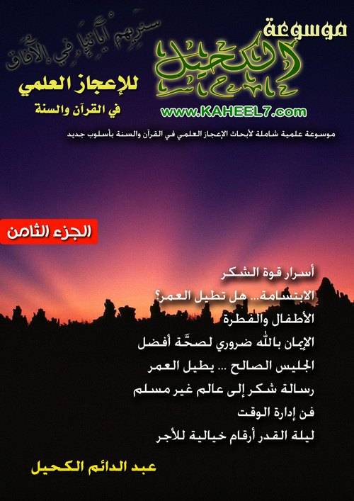 من:الأخ المهندس / عبدالدائم الكحيل موسوعة الكحيل للإعجاز العلمي 8 من جديد نقدم الجزء الثامن في سلسة أبحاث الإعجاز العلمي الخاصة بالموقع ضمن موسوعة سهلة التحميل.. وهذا هو الجزء الثامن.... في هذا الجزء نتناول مواضيع مهمة لابد من اكتشافها مثل أسرار قوة الشكر وأهمية الابتسامة... هل تطيل العمر؟ ونتناول اكتشاف العلماء حول الأطفال والفطرة وأن الإيمان بالله ضروري لصحَّة أفضل.. كذلك نتناول أهمية أن يختار الإنسان أصدقائه ومن يجالسهم: الجليس الصالح ... يطيل العمر.. كما أننا نوجه رسالة شكر إلى عالم غير مسلم، ونختم هذا البحث بمقالة مهمة حول فن إدارة الوقت وكذلك نتناول لمحات من ليلة القدر وكيف يمكن أن تكون خير من ألف شهر ... لتحميل الكتاب على ملف بي دي إف 1.7 ميغا http://www.ataaalkhayer.com/up/download.php?img=3299 بقلم المهندس/ عبد الدائم الكحيل |