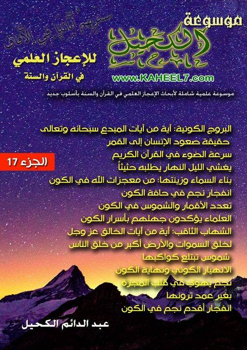 من:الأخ المهندس / عبدالدائم الكحيل موسوعة الكحيل للإعجاز العلمي 17 سوف نرى صوراً رائعة لليل وهو يغشى الشمس وحديث القرآن عن هذه الصورة.. كذلك نتناول حقيقة النجوم النيوترونية (النجم الثاقب).. وحقائق عديدة أخرى.... بفضل لله تعالى تم إنجاز الجزء السادس عشر ونخصصه لعلم الفلك ونتناول العديد من الحقائق الكونية ونبدأ بصدى الانفجار الكبير ودلالاته في القرآن الكريم وكذلك نتناول رؤية جديدة لقوله تعالى: { وَسَخَّر لَكُمُ الشَّمْسَ } . كما نتناول حقيقة الثقوب السوداء وهي التي سماها القرآن بالجوار الكنس من خلال رؤية رؤية جديدة. سوف نرى صوراً رائعة لليل وهو يغشى الشمس وحديث القرآن عن هذه الصورة.. كذلك نتناول حقيقة النجوم النيوترونية (النجم الثاقب).. وحقائق عديدة أخرى: سقوط النيازك يثير دهشة العلماء - أول صورة لكوكب خارج المجموعة الشمسية - المصابيح الكونية.. تشهد على وحدانية الخالق - الأنهار الكونية - الفتق الكوني: حقائق جديدة وأخيراً نتناول حقيقة النسيج الكوني وكيف أنبأ القرآن الكريم عن هذه الحقيقة الكونية.. لتحميل الكتاب على ملف بي دي إف 1.7 ميغا http://www.ataaalkhayer.com/up/download.php?img=3299 بقلم المهندس/ عبد الدائم الكحيل |