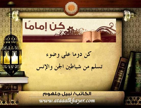 كن إماماً (4) من:الأخ الأستاذ / نبيل جلهوم عضو جمعية الكُتَّاب ببيت عطاء الخير عضو إتحاد الكتّاب و المثقفين العرب - مصر عضو رابطة أدباء الشام – لندن عضو الإتحاد العالمى للشعراء والمبدعين العرب عضو إتحاد المدربين العرب عضو رابطة الأدب الإسلامى العالمية http://www.ataaalkhayer.com/up/download.php?img=7024 |