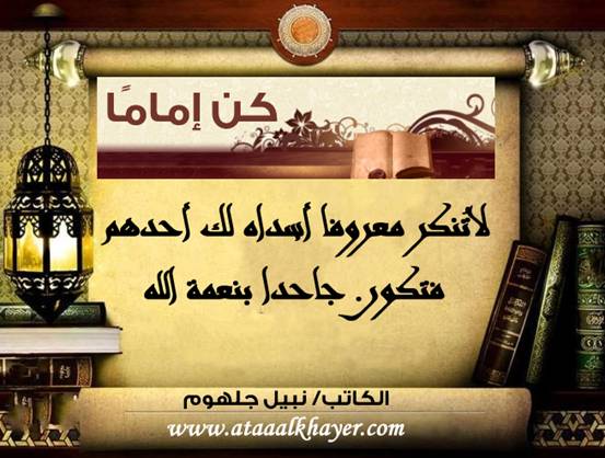 كن إماماً (12) من:الأخ الأستاذ / نبيل جلهوم عضو جمعية الكُتَّاب ببيت عطاء الخير عضو إتحاد الكتّاب و المثقفين العرب - مصر عضو رابطة أدباء الشام – لندن عضو الإتحاد العالمى للشعراء والمبدعين العرب عضو إتحاد المدربين العرب عضو رابطة الأدب الإسلامى العالمية http://www.ataaalkhayer.com/up/download.php?img=7138 |
