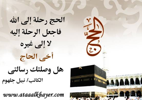 الحج رحلة إلى الله من:الأخ الأستاذ / نبيل جلهوم عضو جمعية الكُتَّاب ببيت عطاء الخير عضو إتحاد الكتّاب و المثقفين العرب - مصر عضو رابطة أدباء الشام – لندن عضو الإتحاد العالمى للشعراء والمبدعين العرب عضو إتحاد المدربين العرب عضو رابطة الأدب الإسلامى العالمية http://www.ataaalkhayer.com/up/download.php?img=7423 |