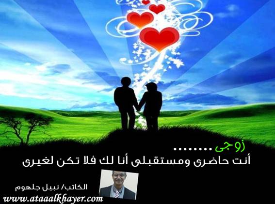 زوجي (1) من:الأخ الأستاذ / نبيل جلهوم عضو جمعية الكُتَّاب ببيت عطاء الخير عضو إتحاد الكتّاب و المثقفين العرب - مصر عضو رابطة أدباء الشام – لندن عضو الإتحاد العالمى للشعراء والمبدعين العرب عضو إتحاد المدربين العرب عضو رابطة الأدب الإسلامى العالمية http://www.ataaalkhayer.com/up/download.php?img=8114 |