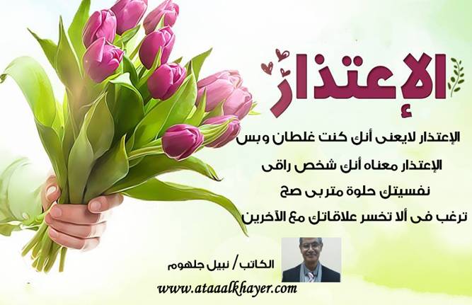 الاعتذار ومعناه من:الأخ الأستاذ / نبيل جلهوم عضو جمعية الكُتَّاب ببيت عطاء الخير عضو إتحاد الكتّاب و المثقفين العرب - مصر عضو رابطة أدباء الشام – لندن عضو الإتحاد العالمى للشعراء والمبدعين العرب عضو إتحاد المدربين العرب عضو رابطة الأدب الإسلامى العالمية http://www.ataaalkhayer.com/up/download.php?img=8552 |