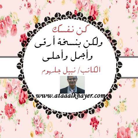 كن نفسك (03) من:الأخ الأستاذ / نبيل جلهوم عضو جمعية الكُتَّاب ببيت عطاء الخير عضو إتحاد الكتّاب و المثقفين العرب - مصر عضو رابطة أدباء الشام – لندن عضو الإتحاد العالمى للشعراء والمبدعين العرب عضو إتحاد المدربين العرب عضو رابطة الأدب الإسلامى العالمية http://www.ataaalkhayer.com/up/download.php?img=8617 |