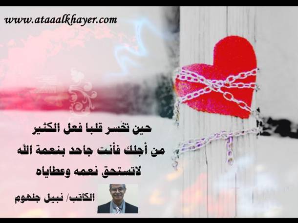 خسارة قلب من:الأخ الأستاذ / نبيل جلهوم عضو جمعية الكُتَّاب ببيت عطاء الخير عضو إتحاد الكتّاب و المثقفين العرب - مصر عضو رابطة أدباء الشام – لندنش عضو الإتحاد العالمى للشعراء والمبدعين العرب عضو إتحاد المدربين العرب عضو رابطة الأدب الإسلامى العالمية http://www.ataaalkhayer.com/up/download.php?img=8709 |