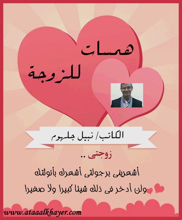 همسات للزوجة (03) من:الأخ الأستاذ / نبيل جلهوم عضو جمعية الكُتَّاب ببيت عطاء الخير عضو إتحاد الكتّاب و المثقفين العرب - مصر عضو رابطة أدباء الشام – لندن عضو الإتحاد العالمى للشعراء والمبدعين العرب عضو إتحاد المدربين العرب عضو رابطة الأدب الإسلامى العالمية http://www.ataaalkhayer.com/up/download.php?img=8809 |