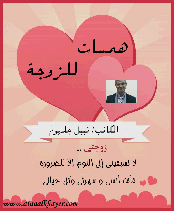 همسات للزوجة (11) من:الأخ الأستاذ / نبيل جلهوم عضو جمعية الكُتَّاب ببيت عطاء الخير عضو إتحاد الكتّاب و المثقفين العرب - مصر عضو رابطة أدباء الشام – لندن عضو الإتحاد العالمى للشعراء والمبدعين العرب عضو إتحاد المدربين العرب عضو رابطة الأدب الإسلامى العالمية http://www.ataaalkhayer.com/up/download.php?img=8895 |