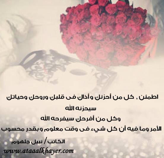اطمئن .. من:الأخ الأستاذ / نبيل جلهوم عضو جمعية الكُتَّاب ببيت عطاء الخير عضو إتحاد الكتّاب و المثقفين العرب - مصر عضو رابطة أدباء الشام – لندن عضو الإتحاد العالمى للشعراء والمبدعين العرب عضو إتحاد المدربين العرب عضو رابطة الأدب الإسلامى العالمية http://www.ataaalkhayer.com/up/download.php?img=9236 |