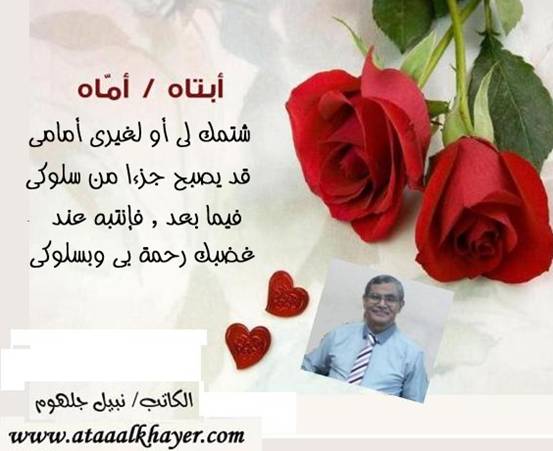 أبتاه/ أماه (17) من:الأخ الأستاذ / نبيل جلهوم عضو جمعية الكُتَّاب ببيت عطاء الخير عضو إتحاد الكتّاب و المثقفين العرب - مصر عضو رابطة أدباء الشام – لندن عضو الإتحاد العالمى للشعراء والمبدعين العرب عضو إتحاد المدربين العرب عضو رابطة الأدب الإسلامى العالمية http://www.ataaalkhayer.com/up/download.php?img=9546 |