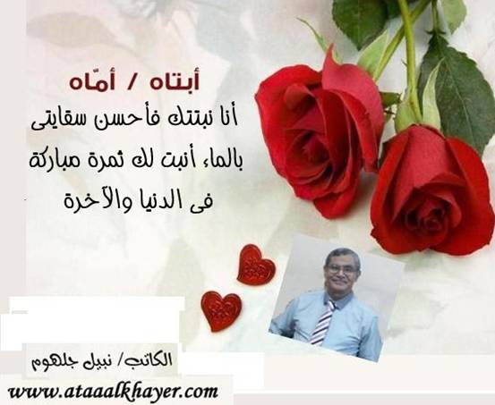أبتاه/ أماه (29) من:الأخ الأستاذ / نبيل جلهوم عضو جمعية الكُتَّاب ببيت عطاء الخير عضو إتحاد الكتّاب و المثقفين العرب - مصر عضو رابطة أدباء الشام – لندن عضو الإتحاد العالمى للشعراء والمبدعين العرب عضو إتحاد المدربين العرب عضو رابطة الأدب الإسلامى العالمية http://www.ataaalkhayer.com/up/download.php?img=9628 |