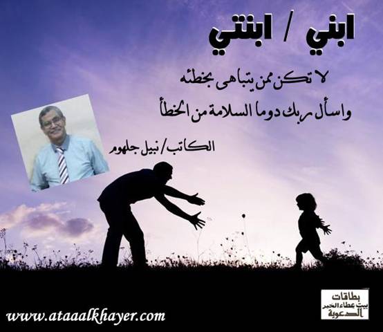 ابني / ابنتي (03) من:الأخ الأستاذ / نبيل جلهوم عضو جمعية الكُتَّاب ببيت عطاء الخير عضو إتحاد الكتّاب و المثقفين العرب - مصر عضو رابطة أدباء الشام – لندن عضو الإتحاد العالمى للشعراء والمبدعين العرب عضو إتحاد المدربين العرب عضو رابطة الأدب الإسلامى العالمية http://www.ataaalkhayer.com/up/download.php?img=9692 |