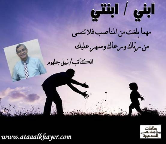 ابني / ابنتي (13) من:الأخ الأستاذ / نبيل جلهوم عضو جمعية الكُتَّاب ببيت عطاء الخير عضو إتحاد الكتّاب و المثقفين العرب - مصر عضو رابطة أدباء الشام – لندن عضو الإتحاد العالمى للشعراء والمبدعين العرب عضو إتحاد المدربين العرب عضو رابطة الأدب الإسلامى العالمية http://www.ataaalkhayer.com/up/download.php?img=9774 |