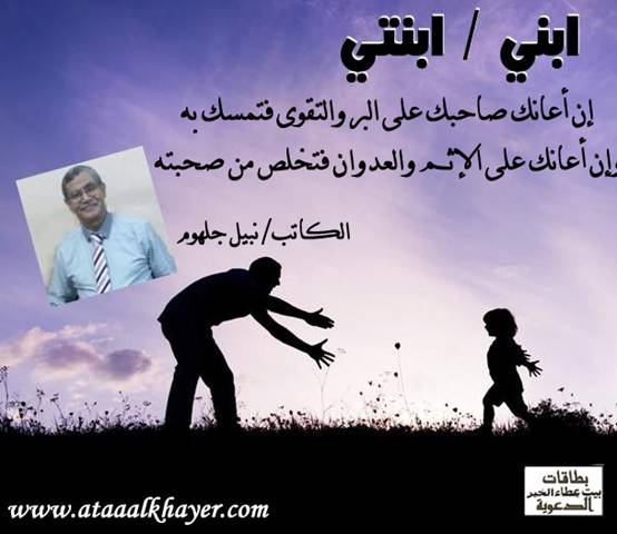 ابني / ابنتي (16) من:الأخ الأستاذ / نبيل جلهوم عضو جمعية الكُتَّاب ببيت عطاء الخير عضو إتحاد الكتّاب و المثقفين العرب - مصر عضو رابطة أدباء الشام – لندن عضو الإتحاد العالمى للشعراء والمبدعين العرب عضو إتحاد المدربين العرب عضو رابطة الأدب الإسلامى العالمية http://www.ataaalkhayer.com/up/download.php?img=9813 |