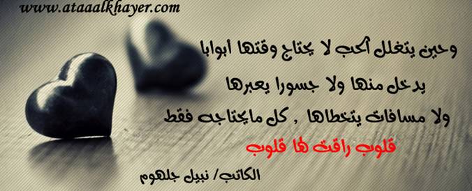 حين ترتقي القلوب من:الأخ الأستاذ / نبيل جلهوم عضو جمعية الكُتَّاب ببيت عطاء الخير عضو إتحاد الكتّاب و المثقفين العرب - مصر عضو رابطة أدباء الشام – لندن عضو الإتحاد العالمى للشعراء والمبدعين العرب عضو إتحاد المدربين العرب عضو رابطة الأدب الإسلامى العالمية http://www.ataaalkhayer.com/up/download.php?img=9971 |