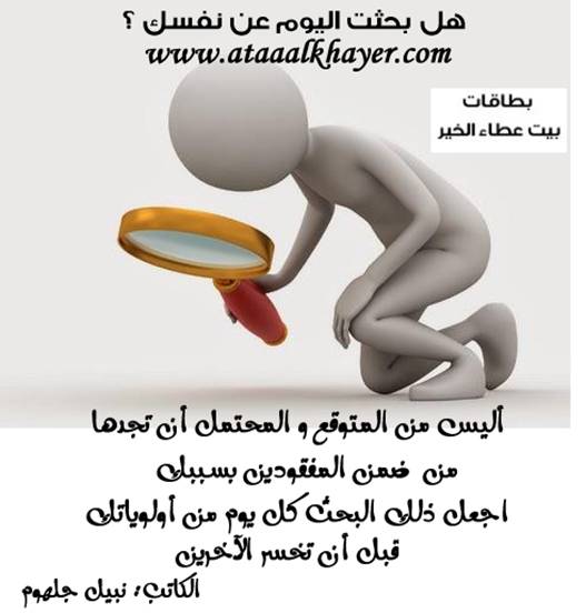 لا تنسى البحث عنها من:الأخ الأستاذ / نبيل جلهوم عضو جمعية الكُتَّاب ببيت عطاء الخير عضو إتحاد الكتّاب و المثقفين العرب - مصر عضو رابطة أدباء الشام – لندن عضو الإتحاد العالمى للشعراء والمبدعين العرب عضو إتحاد المدربين العرب عضو رابطة الأدب الإسلامى العالمية http://www.ataaalkhayer.com/up/download.php?img=10126 |
