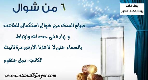 استكمال الطاعة من:الأخ الأستاذ / نبيل جلهوم عضو جمعية الكُتَّاب ببيت عطاء الخير عضو إتحاد الكتّاب و المثقفين العرب - مصر عضو رابطة أدباء الشام – لندن عضو الإتحاد العالمى للشعراء والمبدعين العرب عضو إتحاد المدربين العرب عضو رابطة الأدب الإسلامى العالمية http://www.ataaalkhayer.com/up/download.php?img=10354 |