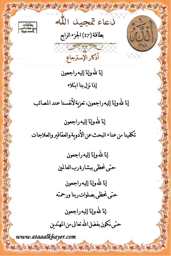 دعاء تمجيد الله بطاقة (17) الجزء الرابع http://www.ataaalkhayer.com/up/download.php?img=9641 من:الأخ الدكتور / عبدالله بن مراد العطرجي عضو جمعية الكُتَّاب ببيت عطاء الخير |