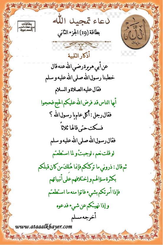 دعاء تمجيد الله بطاقة (19) الجزء الثاني http://www.ataaalkhayer.com/up/download.php?img=9641 من:الأخ الدكتور / عبدالله بن مراد العطرجي عضو جمعية الكُتَّاب ببيت عطاء الخير |