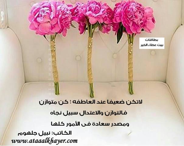التوازن والاعتدال من:الأخ الأستاذ / نبيل جلهوم عضو جمعية الكُتَّاب ببيت عطاء الخير عضو إتحاد الكتّاب و المثقفين العرب - مصر عضو رابطة أدباء الشام – لندن عضو الإتحاد العالمى للشعراء والمبدعين العرب عضو إتحاد المدربين العرب عضو رابطة الأدب الإسلامى العالمية http://www.ataaalkhayer.com/up/download.php?img=10584 |