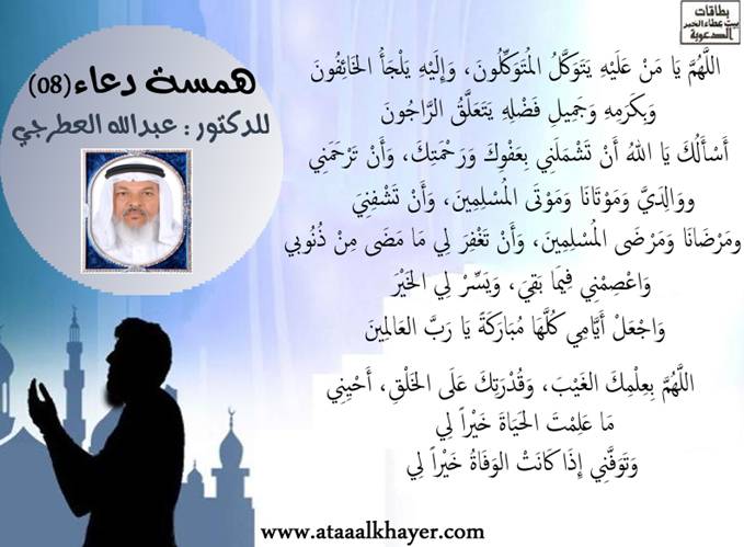 همسة دعاء (08) http://www.ataaalkhayer.com/up/download.php?img=9641 من:الأخ الدكتور / عبدالله بن مراد العطرجي عضو جمعية الكُتَّاب ببيت عطاء الخير |