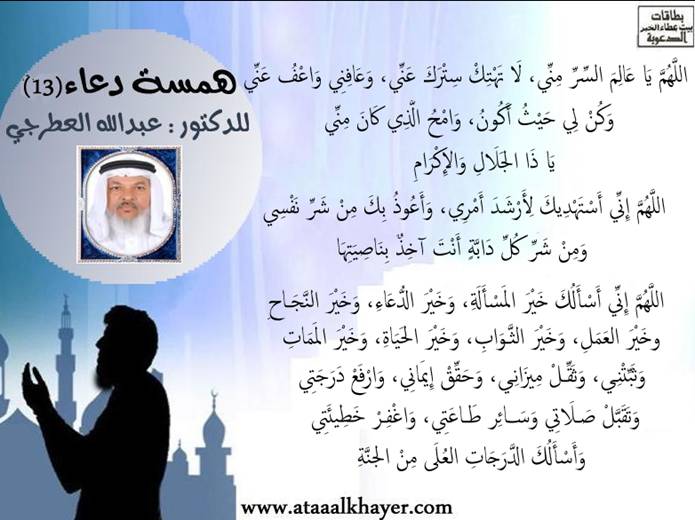 همسة دعاء (13) http://www.ataaalkhayer.com/up/download.php?img=9641 من:الأخ الدكتور / عبدالله بن مراد العطرجي عضو جمعية الكُتَّاب ببيت عطاء الخير |
