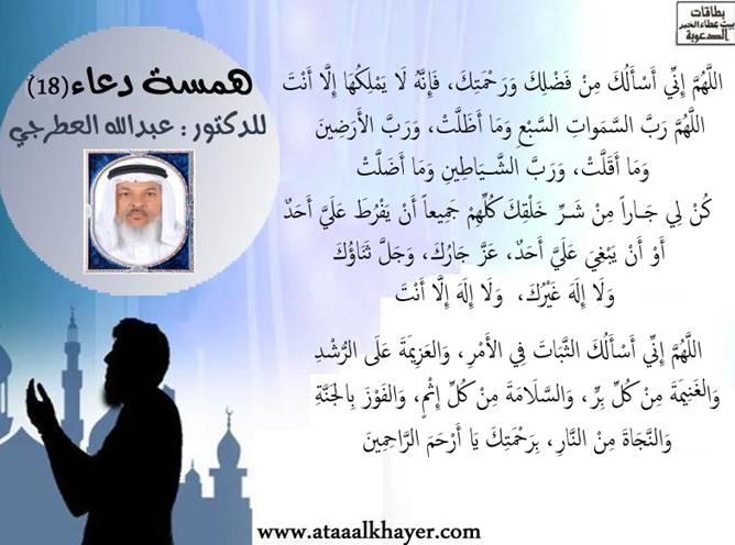 همسة دعاء (18) http://www.ataaalkhayer.com/up/download.php?img=9641 من:الأخ الدكتور / عبدالله بن مراد العطرجي عضو جمعية الكُتَّاب ببيت عطاء الخير |