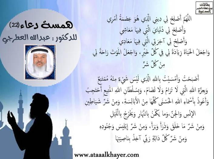 همسة دعاء (22) http://www.ataaalkhayer.com/up/download.php?img=9641 من:الأخ الدكتور / عبدالله بن مراد العطرجي عضو جمعية الكُتَّاب ببيت عطاء الخير |