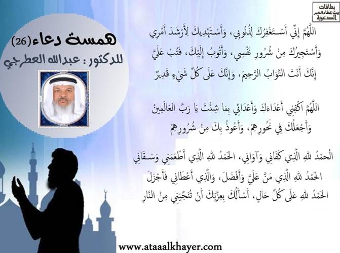 همسة دعاء (26) http://www.ataaalkhayer.com/up/download.php?img=9641 من:الأخ الدكتور / عبدالله بن مراد العطرجي عضو جمعية الكُتَّاب ببيت عطاء الخير |