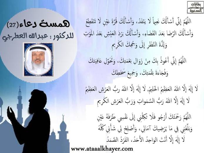 همسة دعاء (27) http://www.ataaalkhayer.com/up/download.php?img=9641 من:الأخ الدكتور / عبدالله بن مراد العطرجي عضو جمعية الكُتَّاب ببيت عطاء الخير |