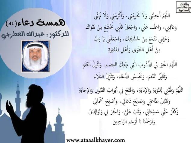 همسة دعاء(41) http://www.ataaalkhayer.com/up/download.php?img=9641 من:الأخ الدكتور / عبدالله بن مراد العطرجي عضو جمعية الكُتَّاب ببيت عطاء الخير |
