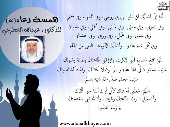 همسة دعاء(52) http://www.ataaalkhayer.com/up/download.php?img=9641 من:الأخ الدكتور / عبدالله بن مراد العطرجي عضو جمعية الكُتَّاب ببيت عطاء الخير |