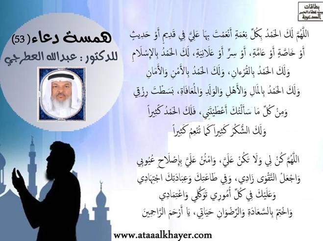 همسة دعاء(53) http://www.ataaalkhayer.com/up/download.php?img=9641 من:الأخ الدكتور / عبدالله بن مراد العطرجي عضو جمعية الكُتَّاب ببيت عطاء الخير |