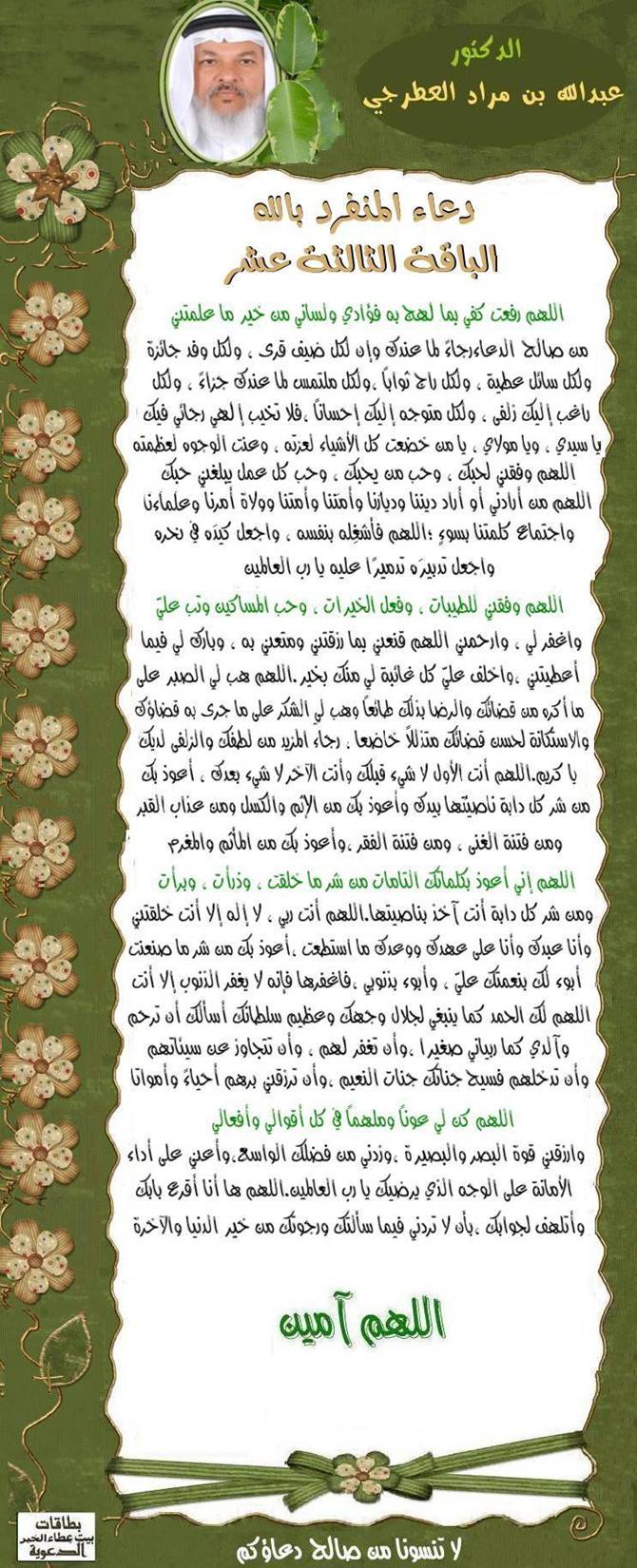 دعاء اليوم http://www.ataaalkhayer.com/up/download.php?img=9642 من:الأخ الزميل / جوود موون - أبو حسن بالتعاون مع الشكر للأخت الفاضلة الزميلة / ديدو دي - خبيرة الأرصاد ببيتنا بطاقات دعاء الأخ الدكتور / عبدالله بن مراد العطرجى |