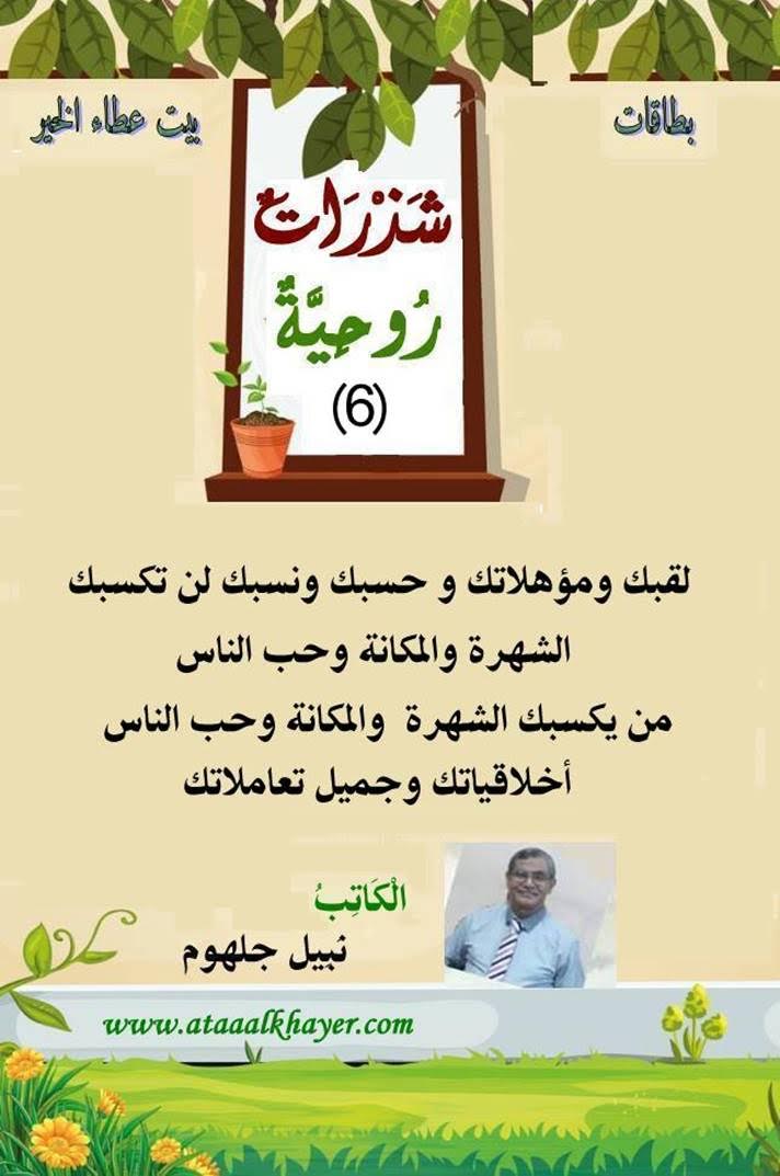 شذرات روحية (06) من:الأخ الأستاذ / نبيل جلهوم عضو جمعية الكُتَّاب ببيت عطاء الخير عضو إتحاد الكتّاب و المثقفين العرب - مصر عضو رابطة أدباء الشام – لندن عضو الإتحاد العالمى للشعراء والمبدعين العرب عضو إتحاد المدربين العرب عضو رابطة الأدب الإسلامى العالمية http://www.ataaalkhayer.com/up/download.php?img=12041 |