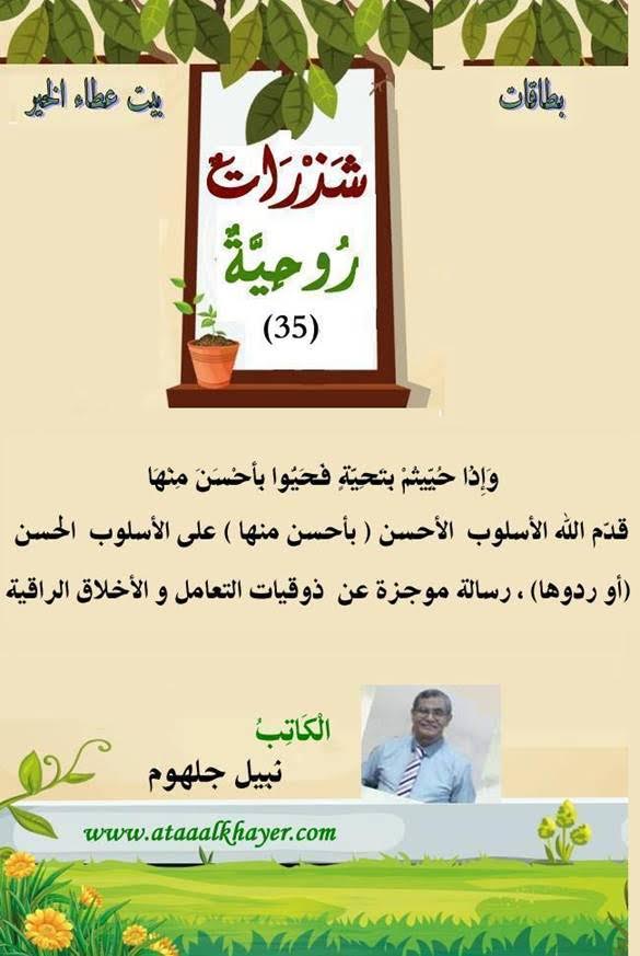 شذرات روحية (35) من:الأخ الأستاذ / نبيل جلهوم عضو جمعية الكُتَّاب ببيت عطاء الخير عضو إتحاد الكتّاب و المثقفين العرب - مصر عضو رابطة أدباء الشام – لندن عضو الإتحاد العالمى للشعراء والمبدعين العرب عضو إتحاد المدربين العرب عضو رابطة الأدب الإسلامى العالمية http://www.ataaalkhayer.com/up/download.php?img=12239 |