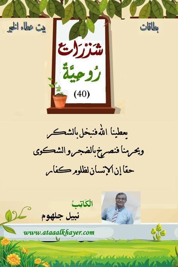 شذرات روحية (40) من:الأخ الأستاذ / نبيل جلهوم عضو جمعية الكُتَّاب ببيت عطاء الخير عضو إتحاد الكتّاب و المثقفين العرب - مصر عضو رابطة أدباء الشام – لندن عضو الإتحاد العالمى للشعراء والمبدعين العرب عضو إتحاد المدربين العرب عضو رابطة الأدب الإسلامى العالمية http://www.ataaalkhayer.com/up/download.php?img=12334 |