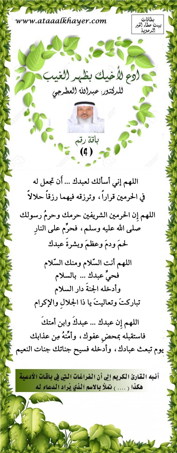 ادع لأخيك بظهر الغيب من سلسة كتب دعاء المنفرد بالله http://www.ataaalkhayer.com/up/download.php?img=9641 بطاقة (4) |