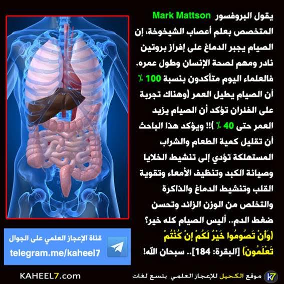 من:الأخ المهندس / عبدالدائم الكحيل http://www.ataaalkhayer.com/up/download.php?img=9641 الصيام كله خيرِ أحبتي في الله.. أحببتُ أن أنقل لكم قولاً لبروفسور غير مسلم ماذا وجد بعد عشرين سنة أبحاث حول الصيام.. لنقرأ ونحمد الله تعالى.... يقول البروفسور Mark Mattson المتخصص بعلم أعصاب الشيخوخة، إن الصيام يجبر الدماغ على إفراز بروتين نادر ومهم لصحة الإنسان وطول عمره. فالعلماء اليوم متأكدون بنسبة 100 % أن الصيام يطيل العمر (وهناك تجربة على الفئران تؤكد أن الصيام يزيد العمر حتى 40 % )!! ويؤكد هذا الباحث أن تقليل كمية الطعام والشراب المستهلكة تؤدي إلى تنشيط الخلايا وصيانة الكبد وتنظيف الأمعاء وتقوية القلب وتنشيط الدماغ والذاكرة والتخلص من الوزن الزائد وتحسن ضغط الدم.. أليس الصيام كله خير؟ إذاً تأملوا معي قول الله تعالى: { وَأَنْ تَصُومُوا خَيْرٌ لَكُمْ إِنْ كُنْتُمْ تَعْلَمُونَ } [البقرة: 184].. بقلم المهندس/ عبد الدائم الكحيل |