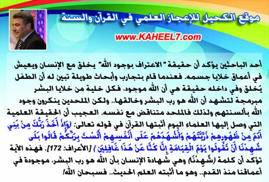 من:الأخ المهندس / عبدالدائم الكحيل http://www.ataaalkhayer.com/up/download.php?img=9641 وأشهدهم على أنفسهم دراسات علمية كثيرة تؤكد أن الإنسان يخلق وهو مبرمج على الإيمان بالله تعالى، ولذلك الإيمان بالله هو جزء من وجودنا وليس كما يدعي الملحدون أنه الدين من اختراع البشر!!.... /COLOR] http://www.ataaalkhayer.com/up/download.php?img=12927 بقلم المهندس/ عبد الدائم الكحيل |