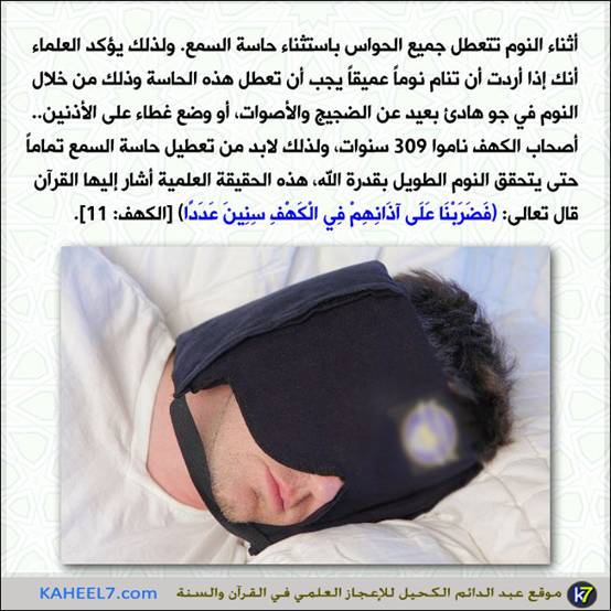 من:الأخ المهندس / عبدالدائم الكحيل http://www.ataaalkhayer.com/up/download.php?img=9641 صورة وآية: فضربنا على آذانهم لقد أنبأ القرآن عن حقيقة علمية تتعلق بالنوم العميق أو الطويل وذلك من خلال تعطيل حاسة السمع لأنها الحاسة الوحيدة التي تعمل أثناء النوم.. لنتأمل. http://www.ataaalkhayer.com/up/download.php?img=13055 بقلم المهندس/ عبد الدائم الكحيل |