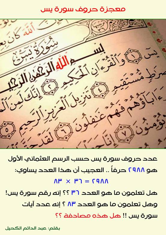 من:الأخ المهندس / عبدالدائم الكحيل http://www.ataaalkhayer.com/up/download.php?img=9641 معجزة حروف سورة يس إنها سورة عظيمة بمعانيها وعظيمة بدقة ترتيبها وإعجازها العددي، سوف نعيش مع نفحة إعجازية لطيفة في حروف هذه السورة.... طالما تأملتُ هذه السورة العظيمة وما تحويه من دلالات ومعاني وعبر وأحكام. ولكن الذي لفت انتباهي أن عدد حروف السورة كما رُسمت في المصحف الشريف (حسب الرسم الأول للقرآن) هو 2988 حرفاً. وأثناء تحليل هذا العدد تبين أنه يساوي: 2988 = 36 × 83 والسؤال ماذا تعني هذه الأرقام وهل من دلالة للعددين 36 و 83 ؟؟ لو تأملنا قليلاً نجد أن العدد 36 هو رقم سورة يس، وأن العدد 83 هو عدد آيات هذه السورة!!! رقم السورة × عدد آياتها = عدد حروفها عزيزي القارئ: ألا تدعوك هذه الملاحظة للتفكر والتأمل وتسبيح الله تعالى؟ http://www.ataaalkhayer.com/up/download.php?img=13224 بقلم المهندس/ عبد الدائم الكحيل |