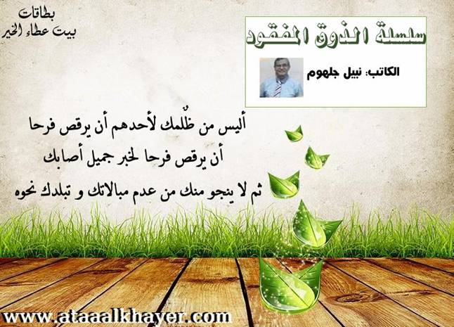 سلسلة الذوق المفقود (06) من:الأخ الأستاذ / نبيل جلهوم عضو جمعية الكُتَّاب ببيت عطاء الخير عضو إتحاد الكتّاب و المثقفين العرب - مصر عضو رابطة أدباء الشام – لندن عضو الإتحاد العالمى للشعراء والمبدعين العرب عضو إتحاد المدربين العرب عضو رابطة الأدب الإسلامى العالمية http://www.ataaalkhayer.com/up/download.php?img=13583 |