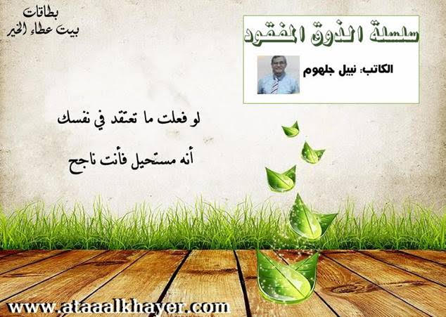 سلسلة الذوق المفقود (12) من:الأخ الأستاذ / نبيل جلهوم عضو جمعية الكُتَّاب ببيت عطاء الخير عضو إتحاد الكتّاب و المثقفين العرب - مصر عضو رابطة أدباء الشام – لندن عضو الإتحاد العالمى للشعراء والمبدعين العرب عضو إتحاد المدربين العرب عضو رابطة الأدب الإسلامى العالمية http://www.ataaalkhayer.com/up/download.php?img=13641 |