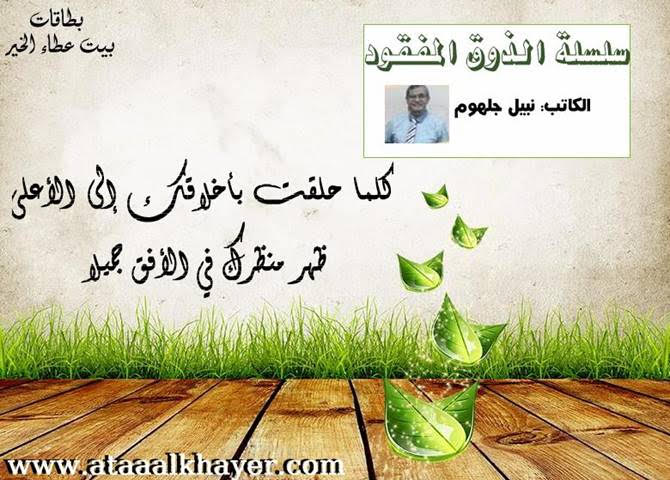 سلسلة الذوق المفقود (14) من:الأخ الأستاذ / نبيل جلهوم عضو جمعية الكُتَّاب ببيت عطاء الخير عضو إتحاد الكتّاب و المثقفين العرب - مصر عضو رابطة أدباء الشام – لندن عضو الإتحاد العالمى للشعراء والمبدعين العرب عضو إتحاد المدربين العرب عضو رابطة الأدب الإسلامى العالمية http://www.ataaalkhayer.com/up/download.php?img=13651 |