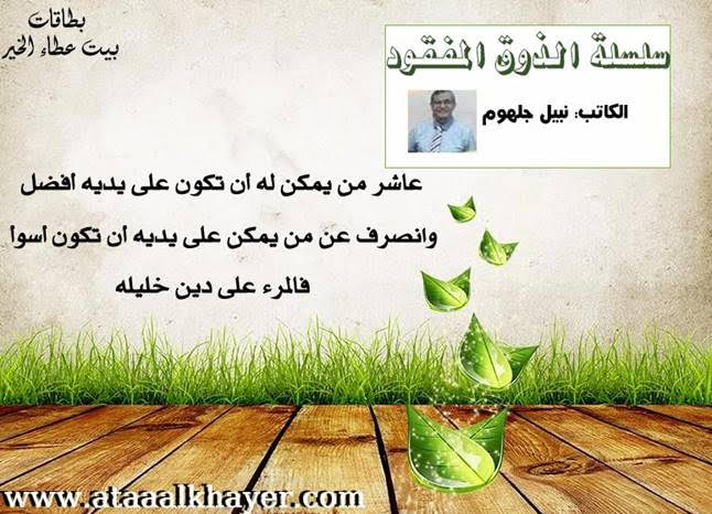 سلسلة الذوق المفقود (23) من:الأخ الأستاذ / نبيل جلهوم عضو جمعية الكُتَّاب ببيت عطاء الخير عضو إتحاد الكتّاب و المثقفين العرب - مصر عضو رابطة أدباء الشام – لندن عضو الإتحاد العالمى للشعراء والمبدعين العرب عضو إتحاد المدربين العرب عضو رابطة الأدب الإسلامى العالمية http://www.ataaalkhayer.com/up/download.php?img=13695 |